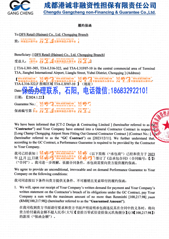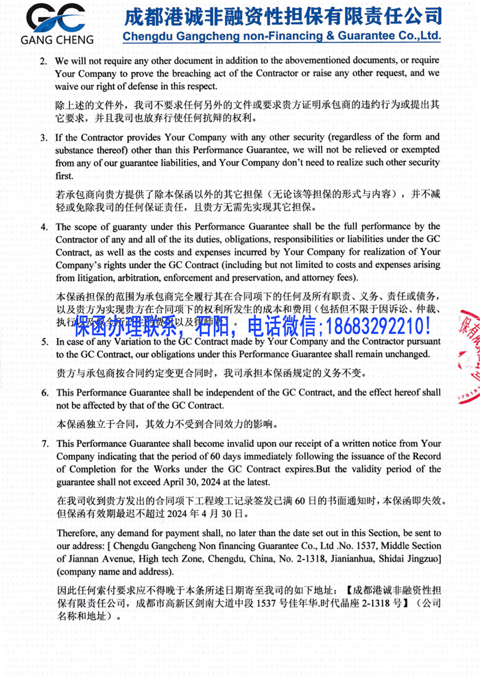 中英文獨(dú)立格式履約保函/2024擔(dān)保公司保函案例一